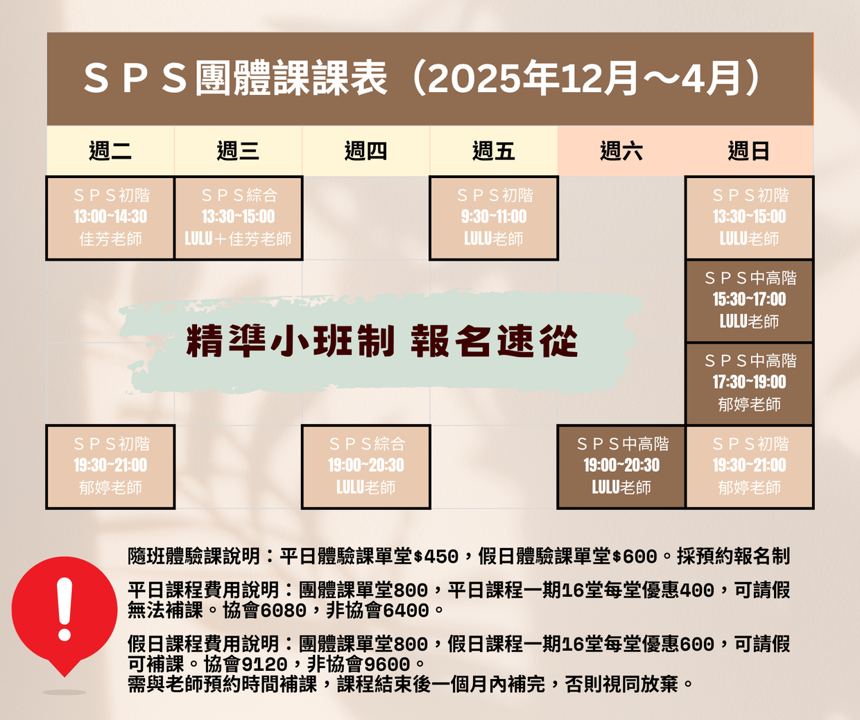 隨班體驗課開放,週二下午、週二晚上、週日晚上,歡迎預約報名